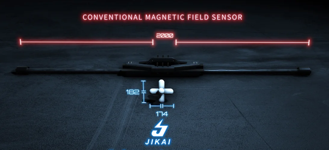 「JIKAI edge AI SENSOR」は従来のセンサーに比べ約2倍もの性能があり、さらに3、4倍と向上を続けています。これほど広範囲を探索することができる磁界センサーは未だかつてありません。